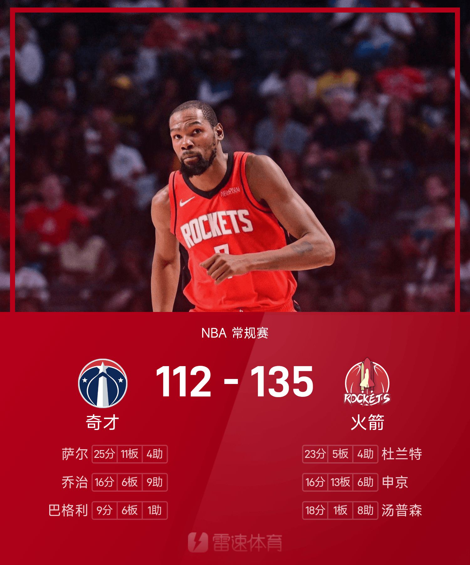 รายงาน NBA: ดูแรนท์ทำ 23 แต้ม ร็อคเก็ตส์เอาชนะวิซาร์ดส์ 135-112