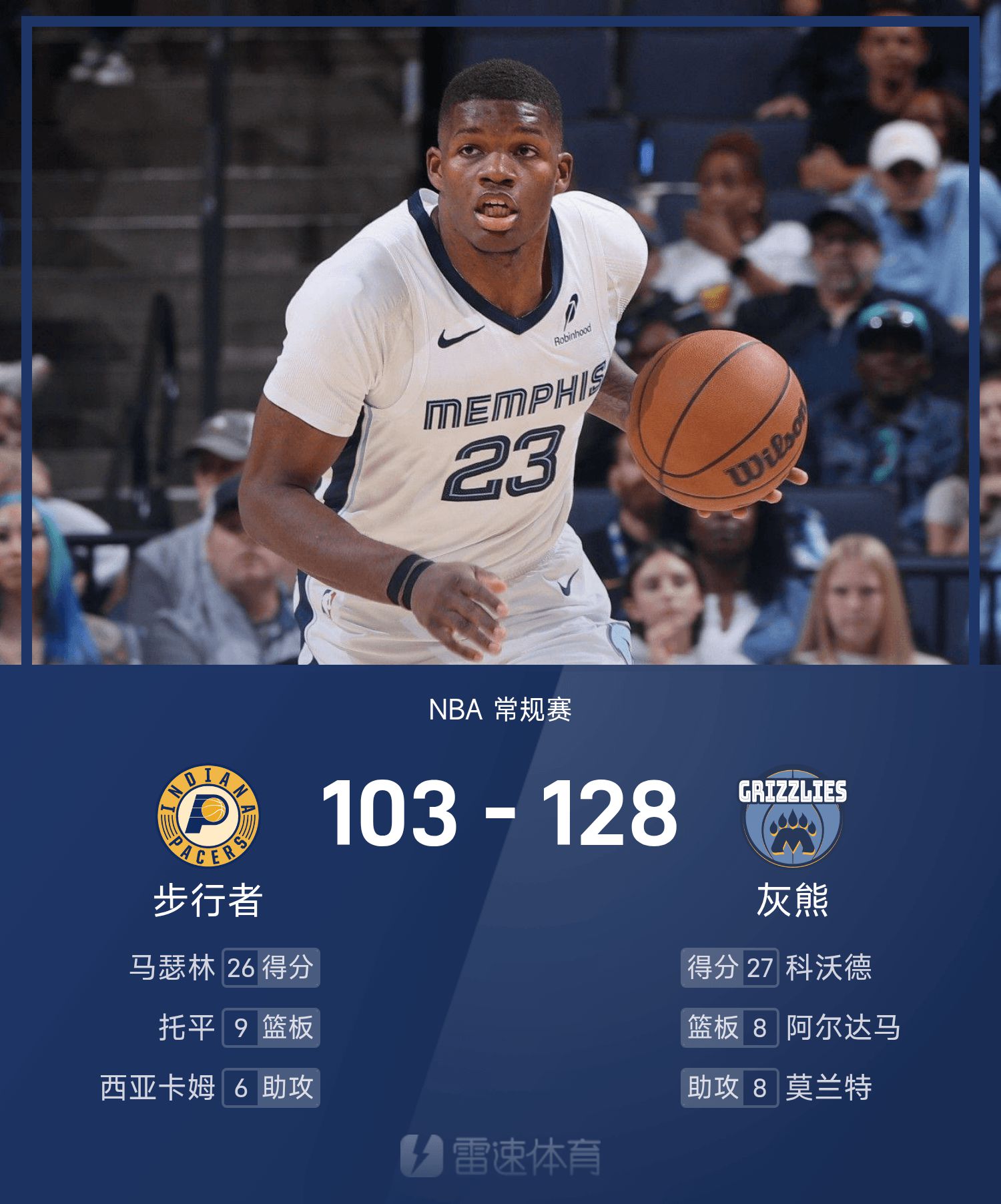 ในตอนท้ายของเกม Grizzlies เอาชนะ Pacers 128-103