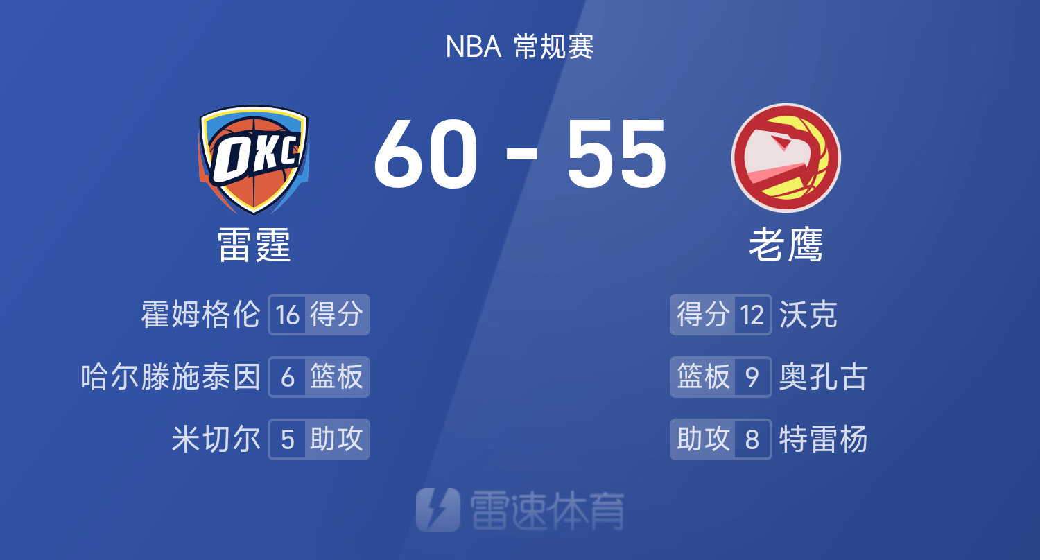 ช่วงพักครึ่ง NBA: โฮล์มเกรน 16 แต้ม, SGA 13 แต้ม 4 รีบาวด์, ธันเดอร์ขึ้นนำ 60-55 เหนือฮอว์กส์