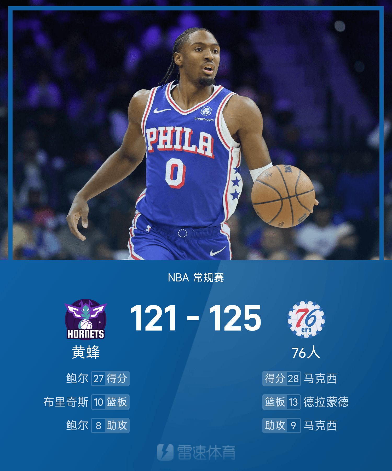 แม็กซี่การ์ด 76ers ทำคะแนน 28 แต้ม 6 รีบาวน์และ 9 แอสซิสต์ ซึ่งเป็นคะแนนสูงสุดในเกม กริมส์ ผู้เล่นสำรองของ 76ers ทำคะแนนได้ 24 แต้มและยิงสามแต้มสำคัญในช่วง 13 วินาทีที่ผ่านมา เพื่อช่วยให้ทีมพลิกสถานการณ์ได้