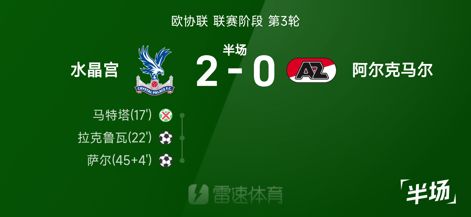 พักครึ่งยูฟ่า : มัตตาพลาดแต้ม, ลาครัวซ์จ่ายบอล, คริสตัล พาเลซ 2-0 อัลค์มาร์