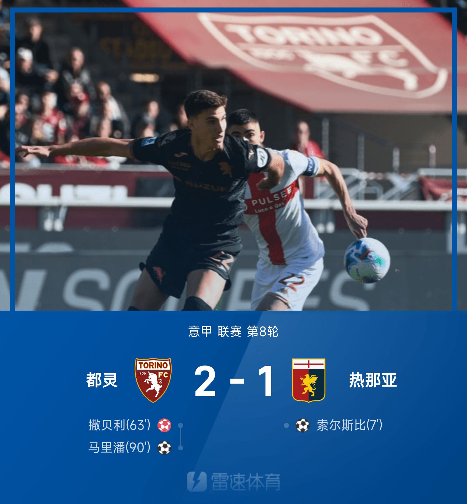 รายงานผลการแข่งขันเซเรียอา ซาเบลลี่ยิงเข้าประตูตัวเอง, มาริปานยิงประตูสุดท้าย, โตริโน่พลิกเจนัว 2-1