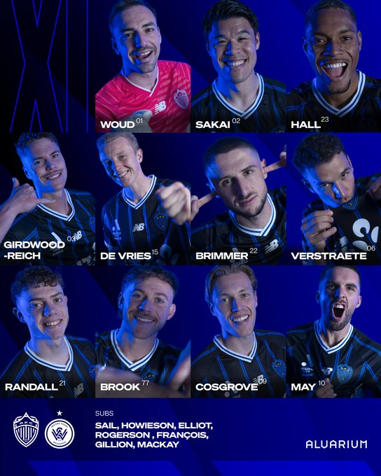 รายชื่อตัวจริงของ Oakland FC: 1-Ward, 2-Hiroki Sakai, 15-De Vries, 23-Hall, 3-Girdwood-Reich, 22-Brimmer, 6-Fraster, 77-Brook, 21-Randall, 9-Cosgrove, 10-May
