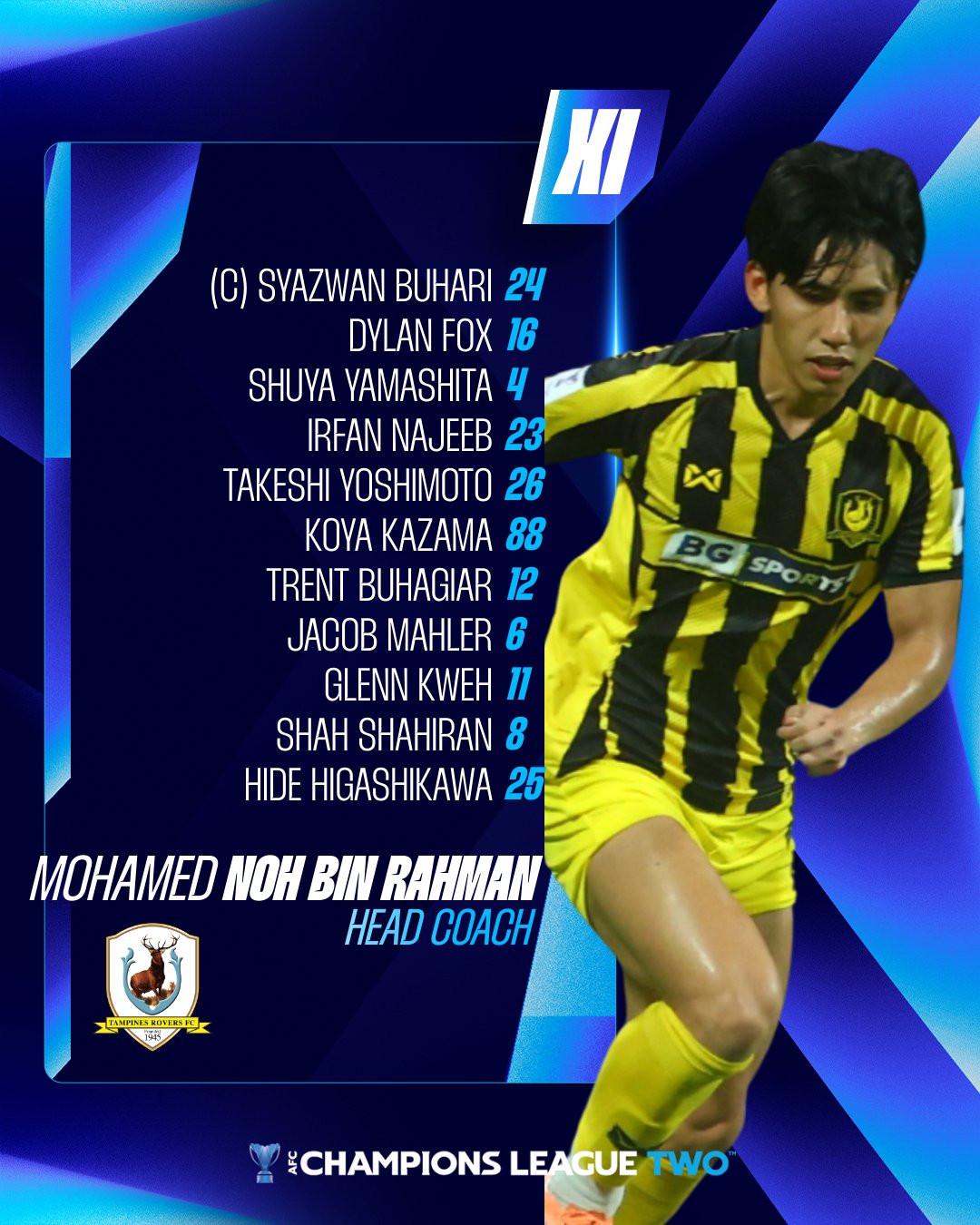แทมปิเนส วันเดอเรอร์ส รายชื่อตัวจริง:24-บูฮาริ, 16-ฟ็อกซ์, 23-นาจิบ, 4-ยามาชิตะ ฮิอิรากิ, 26-โยชิโมโตะ ทาเคชิ, 88-คาซามะ ฮิโรย่า, 12-บูฮาจิร์, 8-ชาฮิลัน, 6-มาห์เลอร์, 11-กัว เจียซู, 25-ฮิกาชิคาว่า สึสึมิ