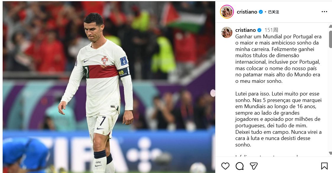 อย่างไรก็ตาม มุมมองของโรนัลโด้หลังฟุตบอลโลกกาตาร์ปี 2022 นั้นแตกต่างไปมากจากตอนนี้ หลังจากที่โปรตุเกสพ่ายแพ้ต่อโมร็อกโกอย่างไม่พอใจ โรนัลโด้โพสต์บนโซเชียลมีเดียว่าการคว้าแชมป์ฟุตบอลโลกให้กับโปรตุเกสเป็นความฝันที่ยิ่งใหญ่ที่สุดในอาชีพของเขา และเขาไม่เคยยอมแพ้กับความฝันนี้