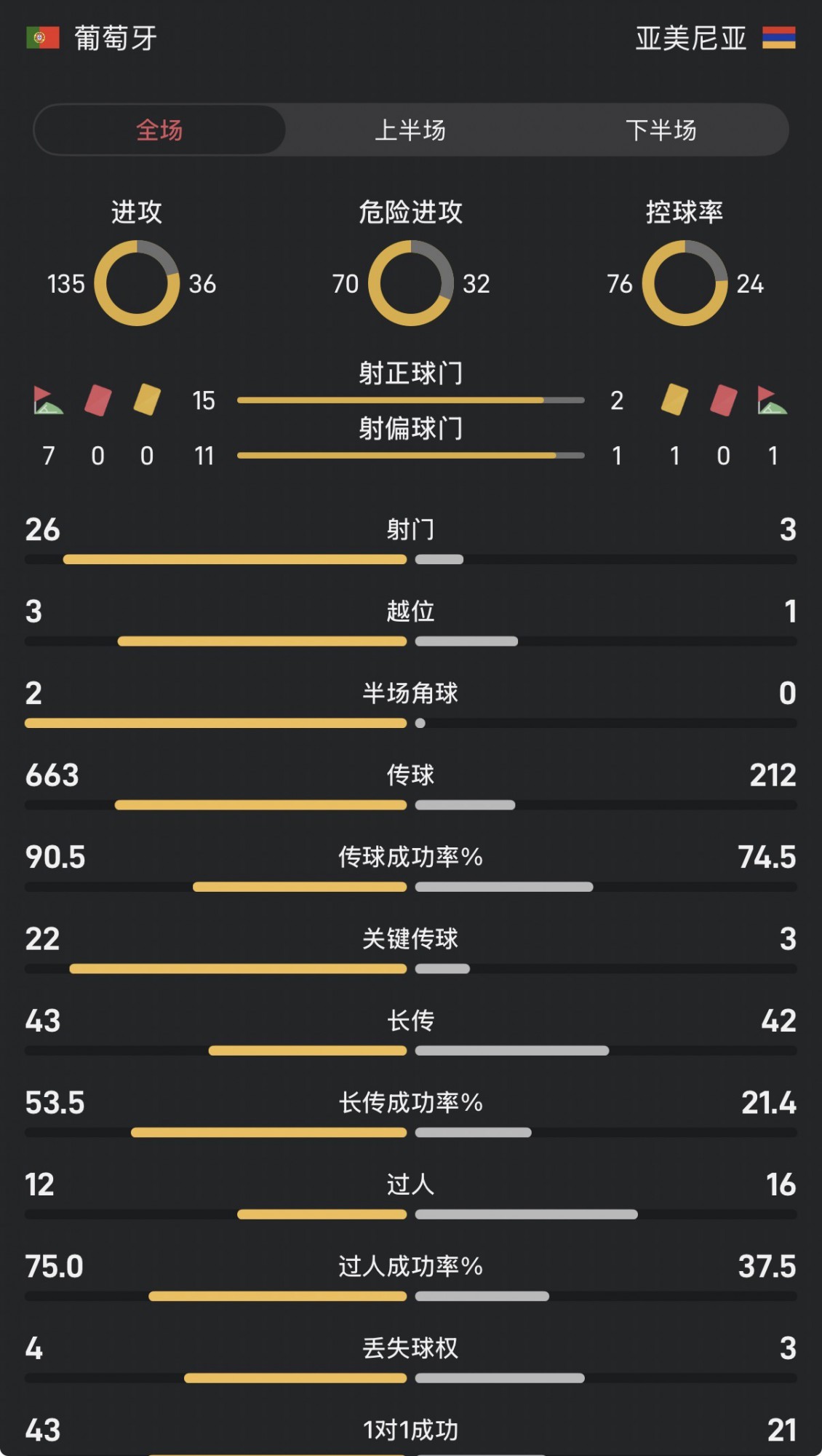 สถิติเต็มเกมระหว่าง โปรตุเกส พบ อาร์เมเนีย อัตราการเลี้ยงบอล 76-24 ประตู 26-3