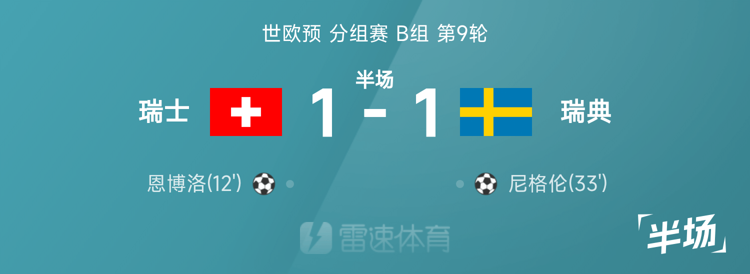 พักครึ่งแรกของยุโรปโลก: เอ็มโบโลทำประตู, ไนเกรนตีเสมอ, สวิตเซอร์แลนด์ 1-1 สวีเดนชั่วคราว