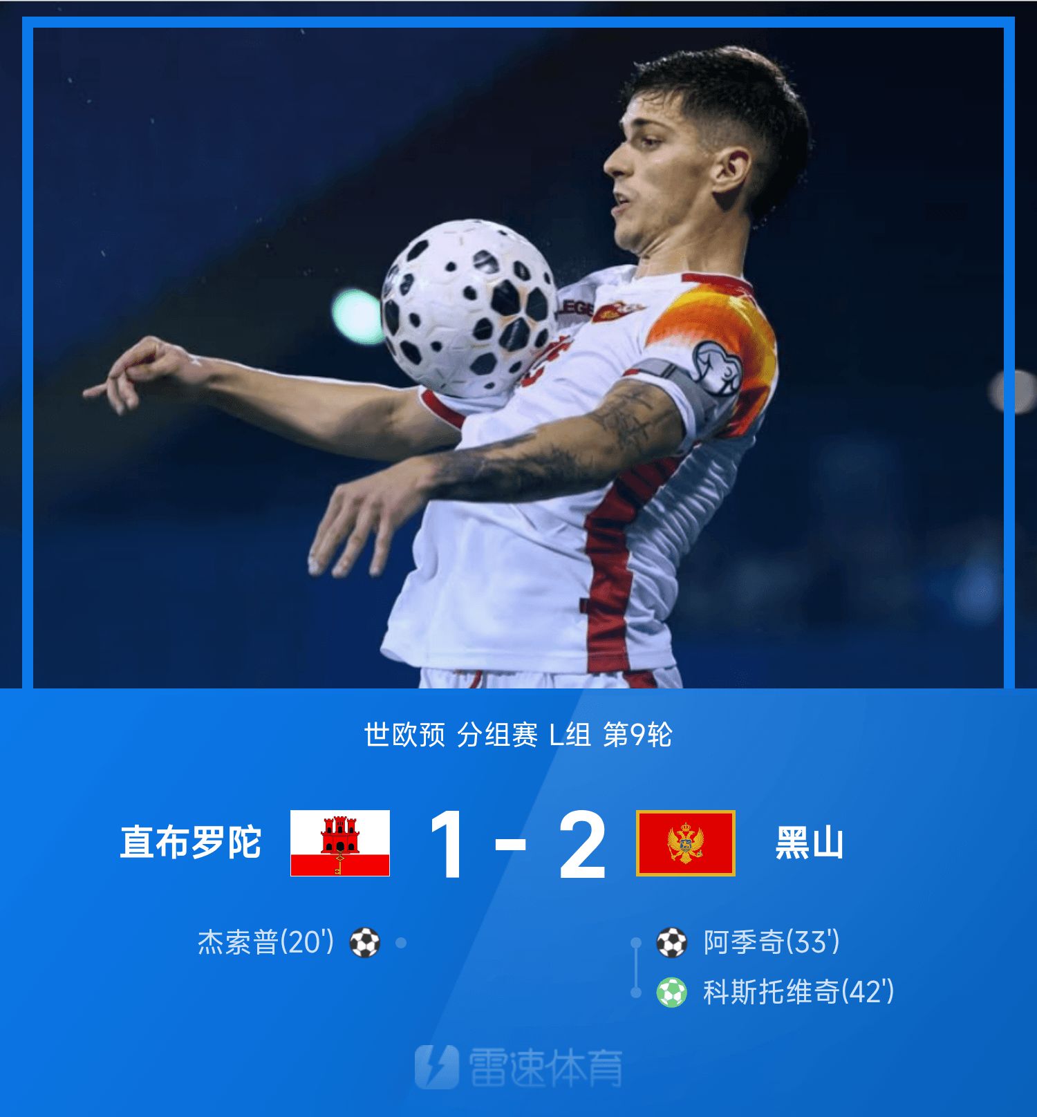 6686 Sports รายงานเมื่อวันที่ 15 พฤศจิกายนว่าในรอบที่เก้าของกลุ่ม L ของรอบคัดเลือกยุโรปโลก ยิบรอลตาร์เผชิญหน้ากับมอนเตเนโกรที่สนามทีมเหย้า ในครึ่งแรกของแคมเปญนี้ Jessop ยิงประตูเดียว Adzic เตะฟรีคิกเพื่อเสมอกันในเกม และ Kostovich ยิงจุดโทษ หลังจากเปลี่ยนข้างและทะเลาะกันอีกครั้งก็ไม่มีใครทำประตูได้ จบเกม มอนเตเนโกร 2-1 ยิบรอลตาร์