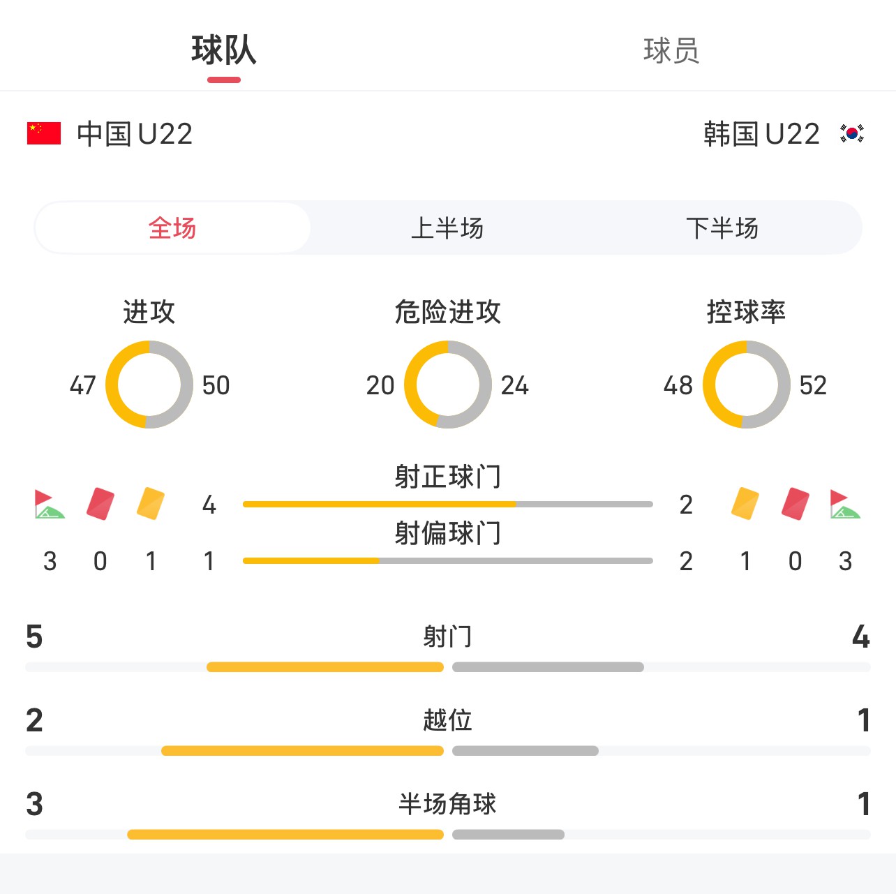 U22 จีน vs เกาหลีใต้ U22 สถิติเต็มเกม: